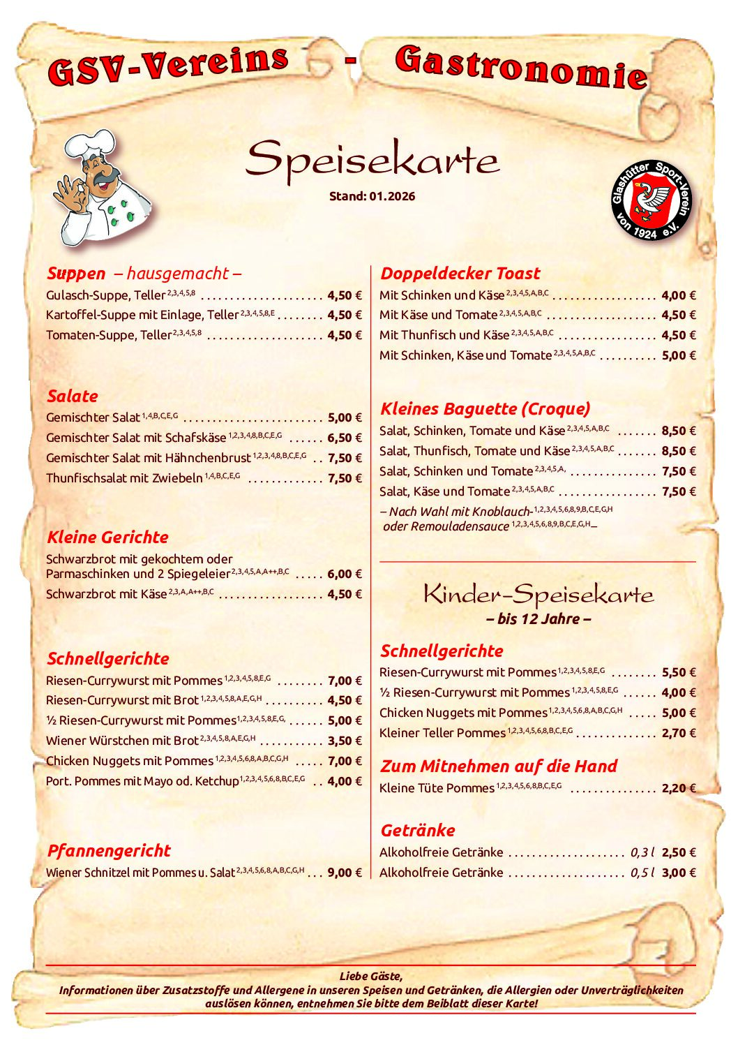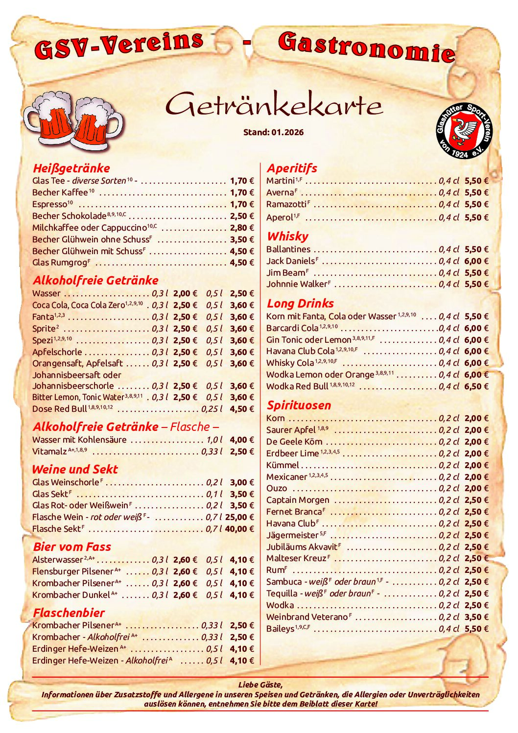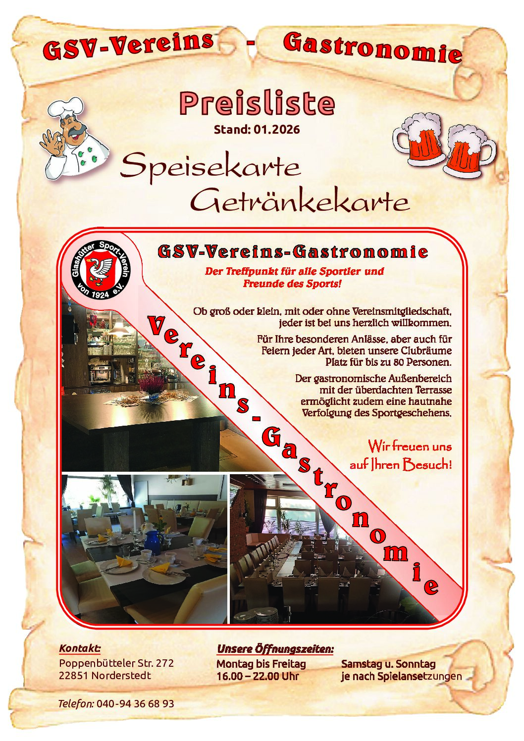 Die GSV-Vereins-Gastronomie ist DER Treffpunkt für alle Sportler und Freunde des Sports! Ob groß oder klein, vereinsintern oder vereinsextern, jeder ist bei uns willkommen. Neben einem großen Innenbereich für bis zu 80 Personen, haben wir auch noch einen Außenbereich, um insbesondere im Sommer auf der Terrasse eine leckere Currywurst oder eine kühle Erfrischung zu genießen. Und natürlich nebenbei Fußball schauen.